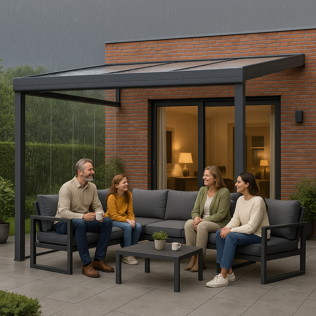 Mit optionalen Glasschiebewänden, LED-Beleuchtung oder Seitenteilen verwandeln Sie Ihr Terrassendach in einen hellen, geschützten Wohnraum.